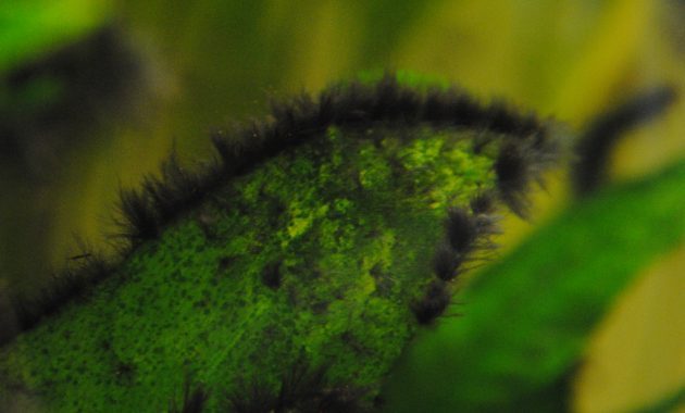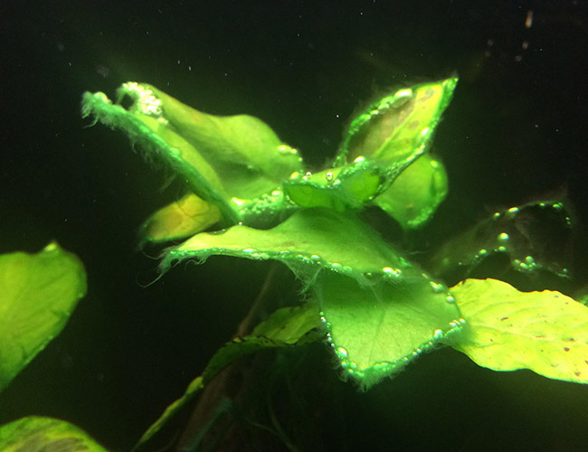 Особенно заметны обрастания на черешках эхинодорусов, на стеблях длинностебельных растений, на кончиках листьев.