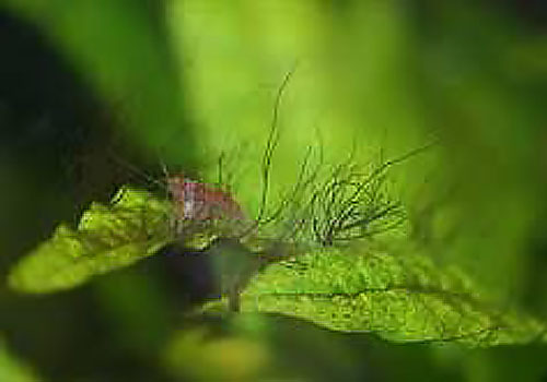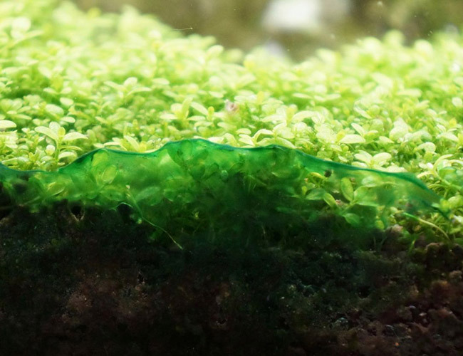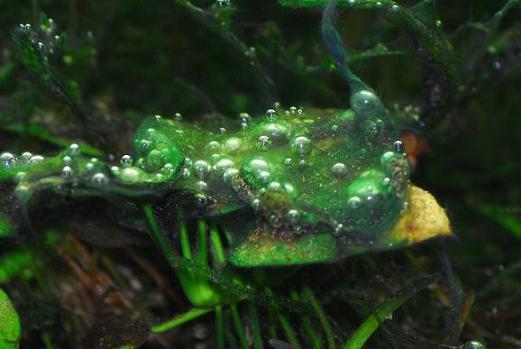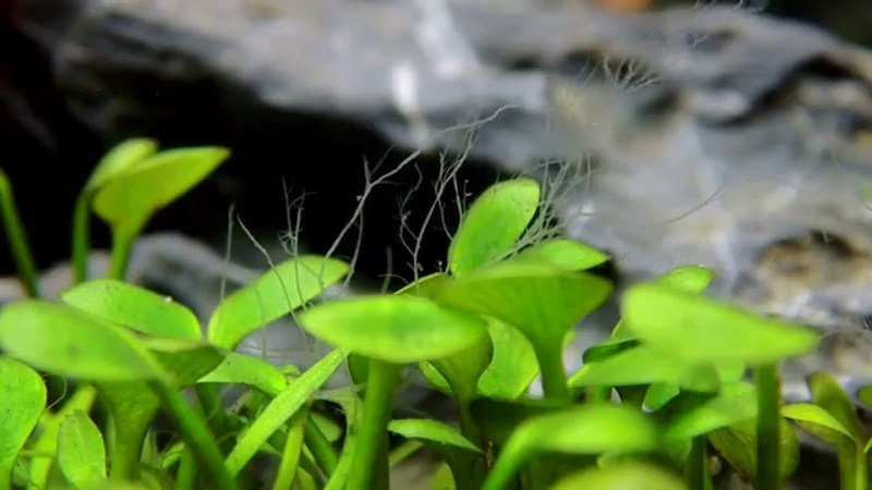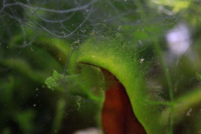 Прикрепившаяся к листьям медленно растущих растений, субстрату, стеклам аквариума по мере разрастания опутывает растения.