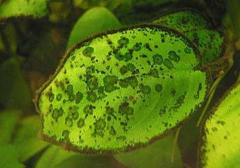 Налет имеет вид точечных округлых зеленых пятен, имеющих окрашенность в гамме от светло-зеленого до темно-зеленого цвета, возникающих на листьях растений.