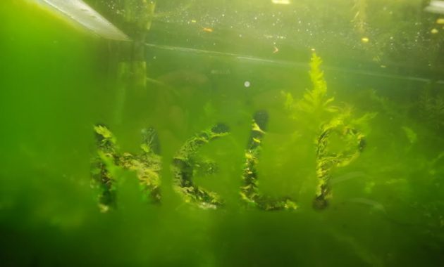 Вода в аквариуме приобретает зеленый цвет, иногда говорят «начинает цвести». Растения же и элементы декора часто могут оставаться чистыми.