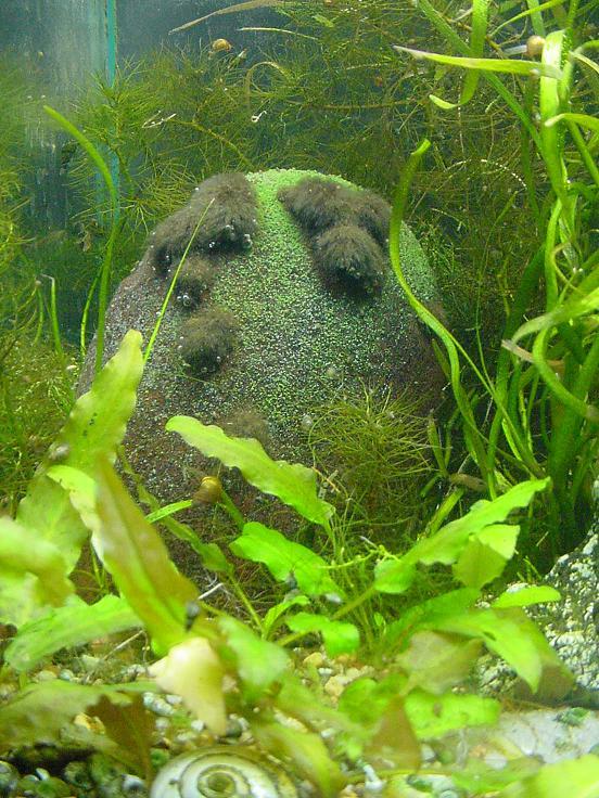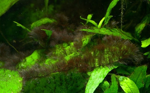 Водорослевые обрастания выглядят как короткие тонкие нити, покрывающие субстрат, элементы декора, листья растений, придавая им своеобразный пушистый вид.