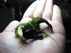 Внешний вид – обрастания имеют вид очень длинных нитей темно-зеленого цвета. Нити могут быть одиночными или формировать пучок. Каждая нить одним концом крепится к стеклу, или поверхности декораций, или же к поверхности листьев. Поэтому часто пучок выглядит как растущий из одного места или точки. На нитях видны одиночные утолщения, своеобразные бусинки.