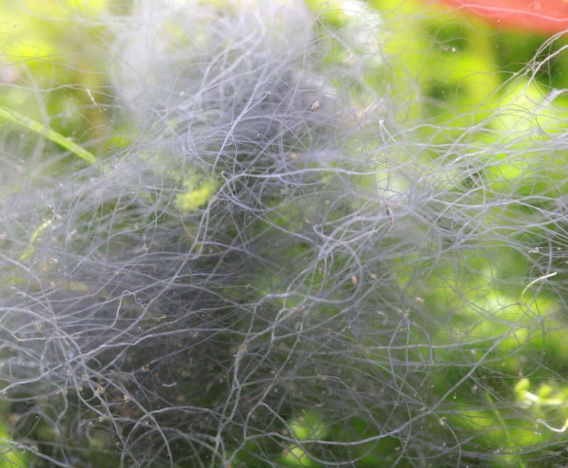 В запущенных аквариумах это обрастание напоминает спирогиру, но при внимательном рассмотрении видно, что нити более короткие.