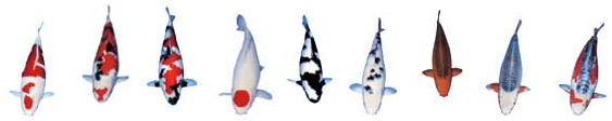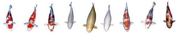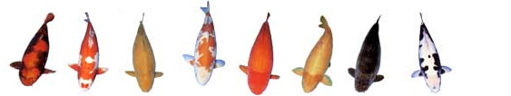 (Kohaku, Taisho-Sanshoku, Showa-Sanshoku, Tancho, Shiro-Utsuri, Bekko, Aka-Matsuba, Asagi Shusui)